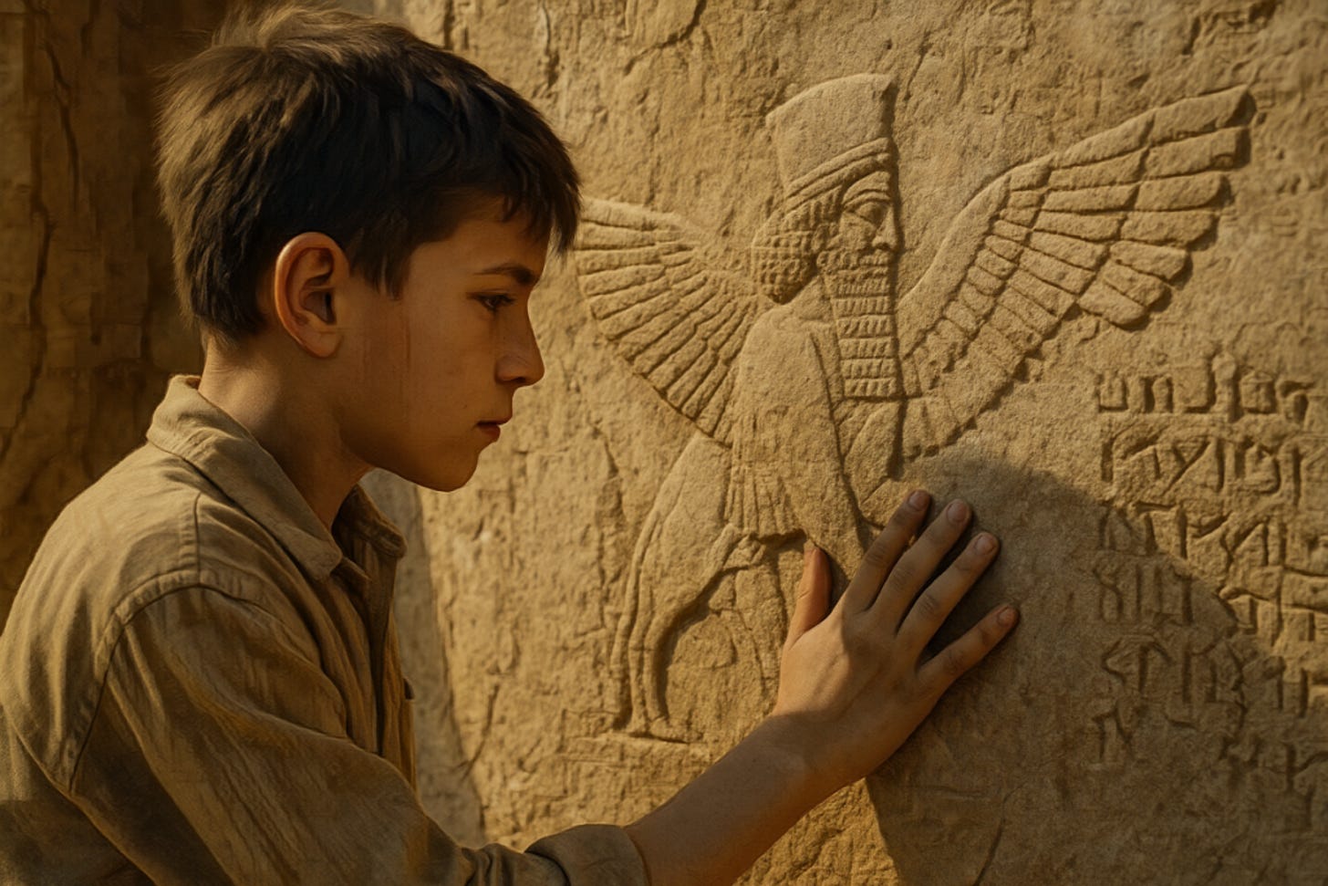 The boy looked back once more before leaving the ruins. The sand blew, but the stone remained. He pressed his hand to a broken relief—a winged bull, a warrior, a name half-faded.