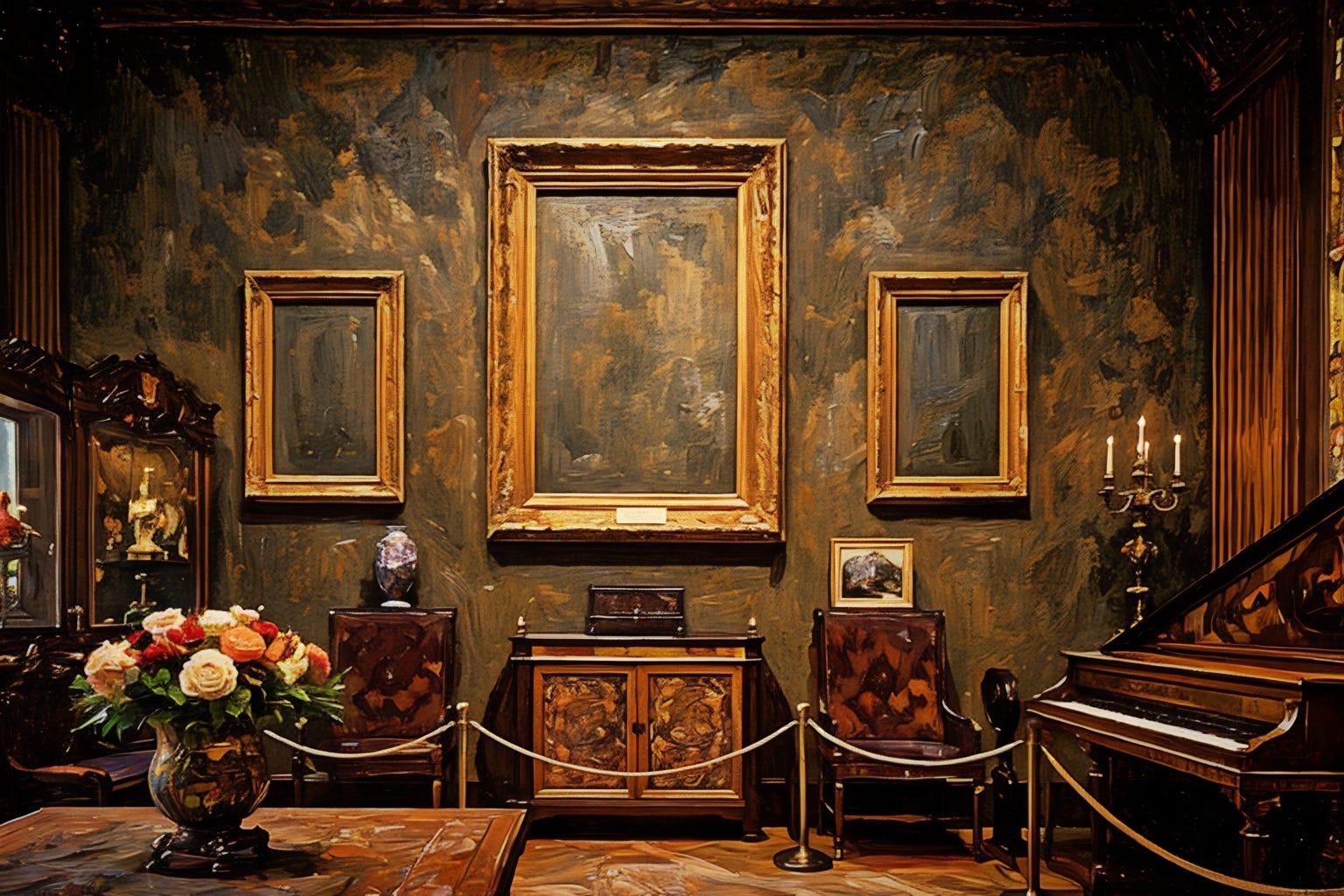 The Isabella Stewart Gardner Museum still displays the empty frames where the works once hung. The museum’s founder required that the galleries remain unchanged, so the empty rectangles remain exactly where the paintings disappeared.
